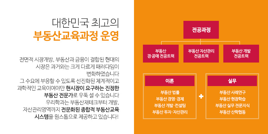 • 대한민국 최고의 부동산 교수진 - 우리 부동산학과의 교수님들은 이론과 실무에 탁월한 최고의 부동산 전문가로써 교과 과정별로 확실하게 모셨습니다!